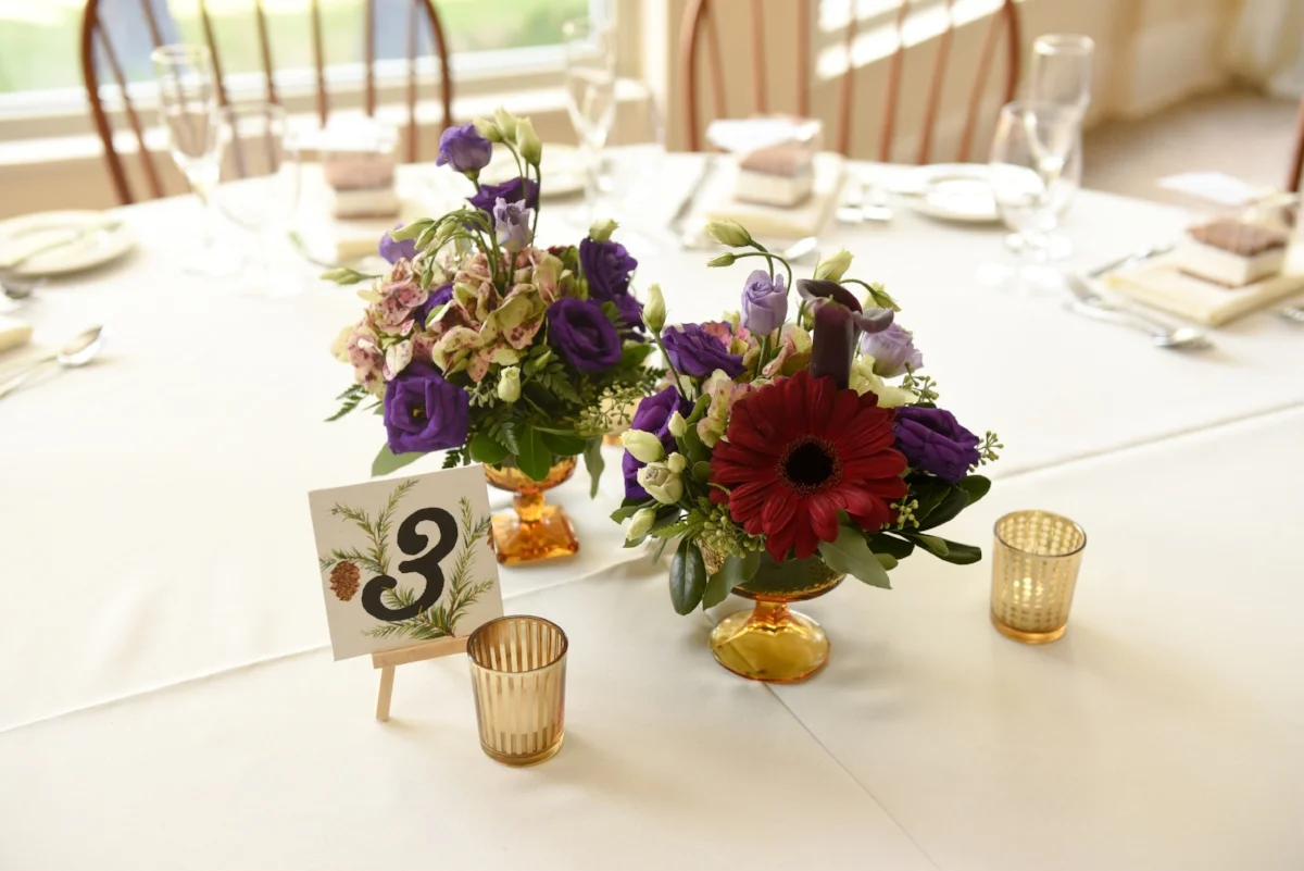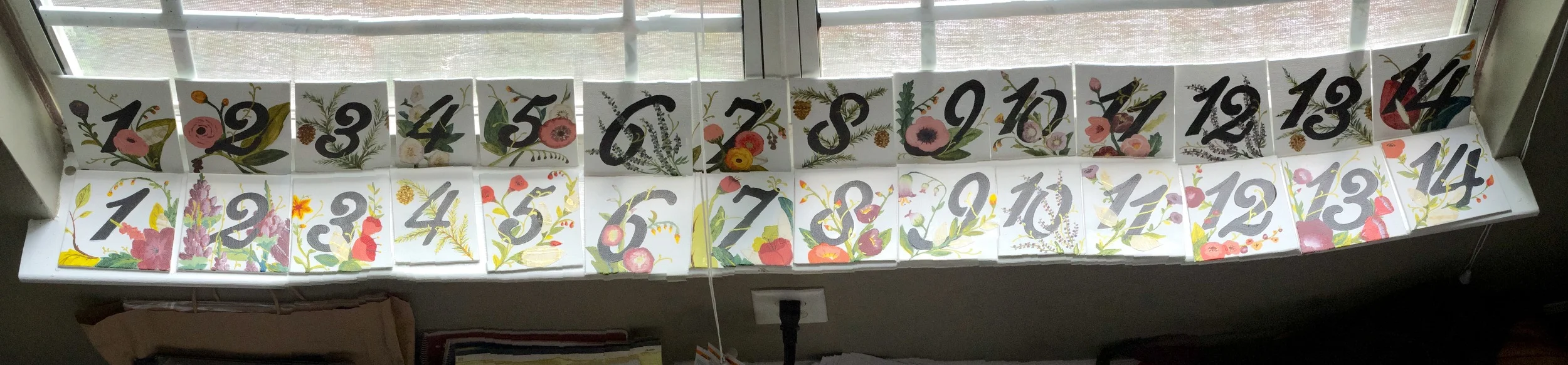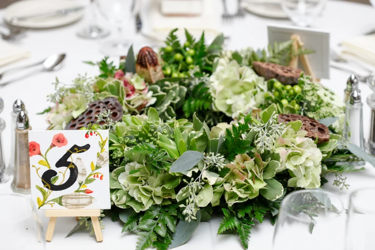 As we considered the overall aesthetic, we often found ourselves drawn to the floral designs from Rifle Paper Co. That soft, whimsical, hand-drawn aesthetic really resonated with us and as we considered options for table numbers we were, at one point, close to purchasing their Botanical Number set. But the desire for a decidedly unique solution won out, and Kurt ended up designing and painting two sets of 14 table number canvases instead!