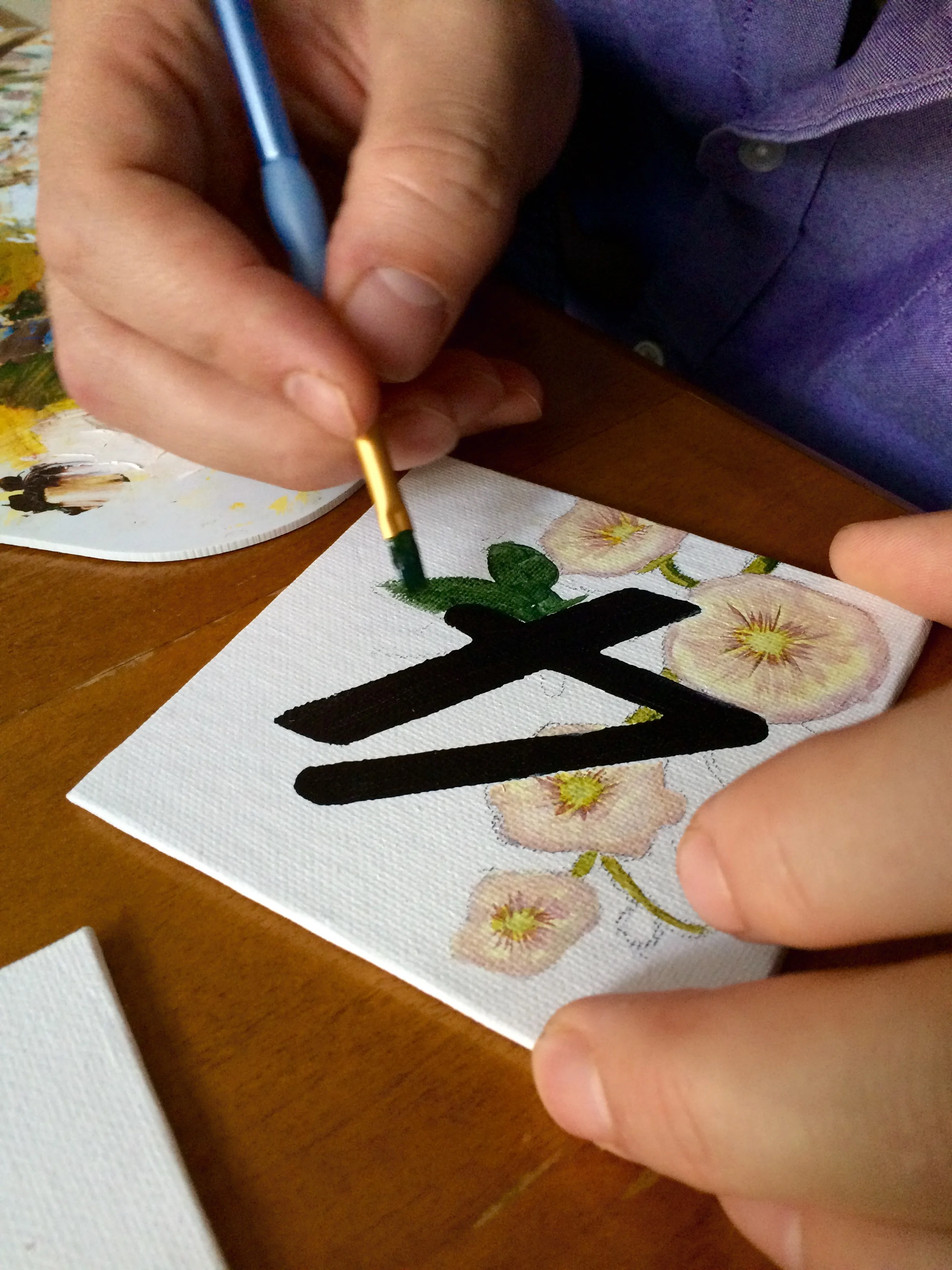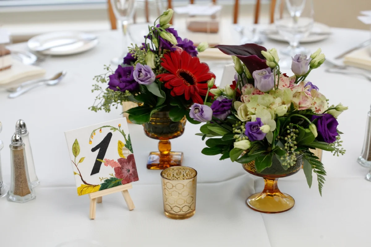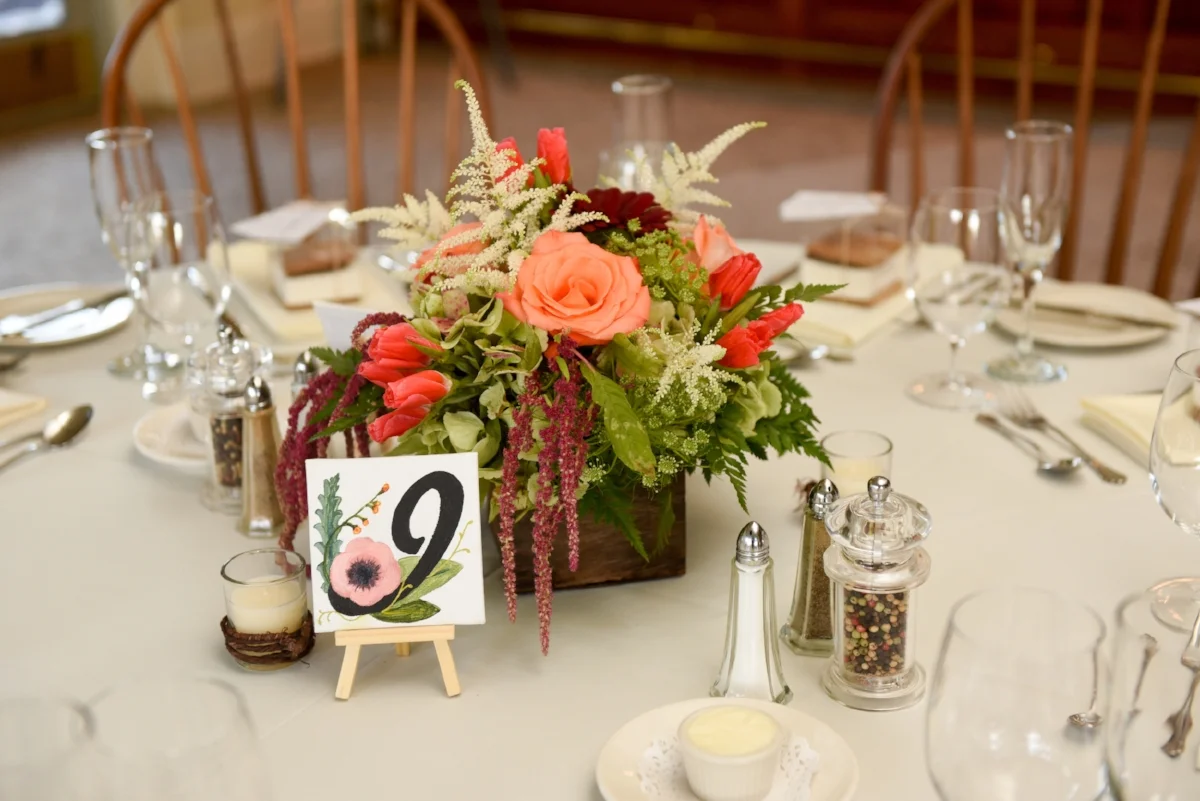 For this project, Kurt used 4x4 inch square flat canvases we purchased from Michael's. I stenciled the numbers on each canvas in basic black acrylic paint, and then he took charge of the process from there, sketching each design by hand before beginning to paint them one by one. Little details were included that connected back to our paper elements: the metallic gold brushstroke fine art paper was included on some of the numbers to add texture, while a gold paint pen that had also been used to address our invitations was used to add small details. Each table received two numbers, one placed on either side of the centerpieces, displayed on small wooden easels.
